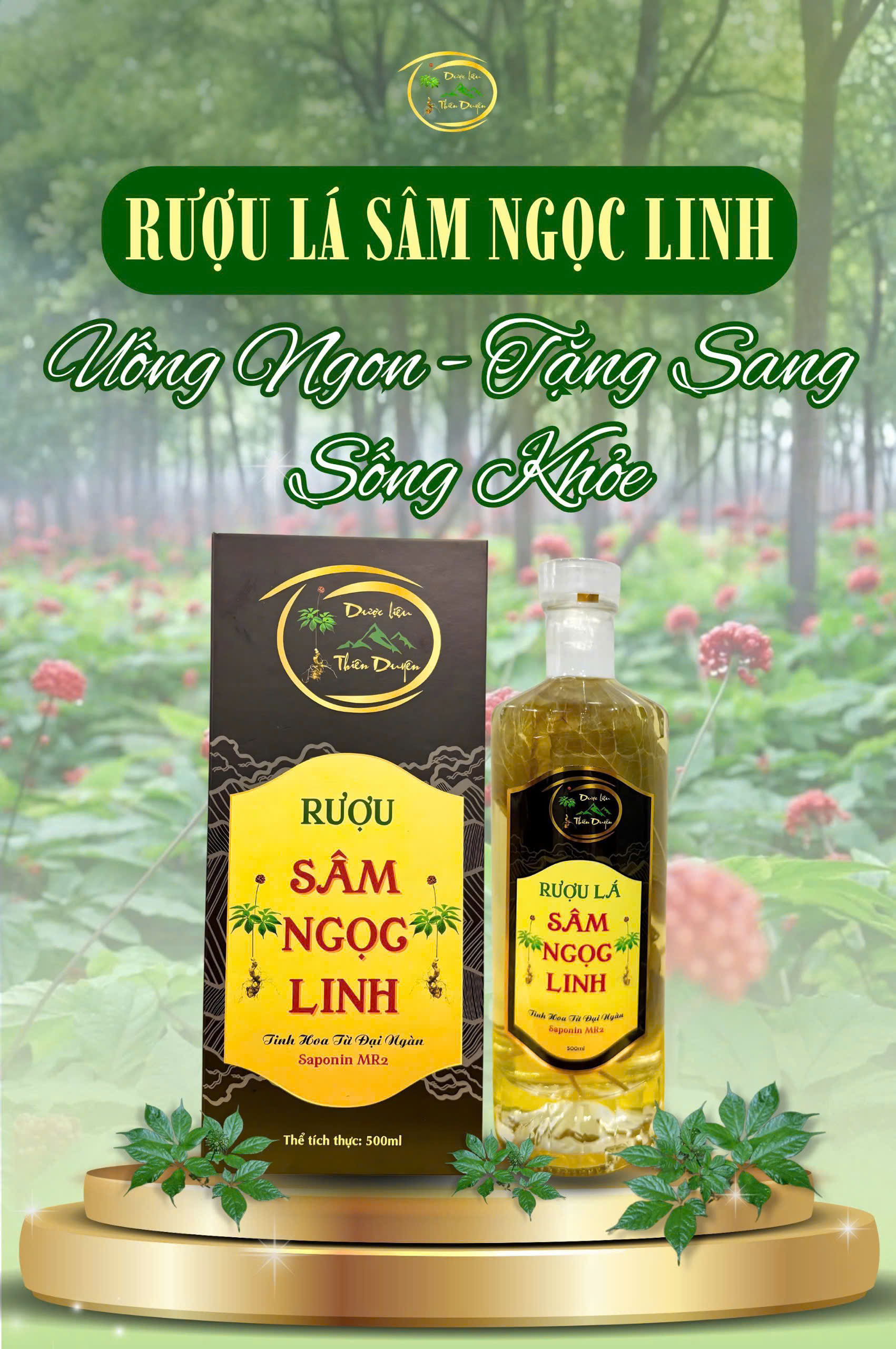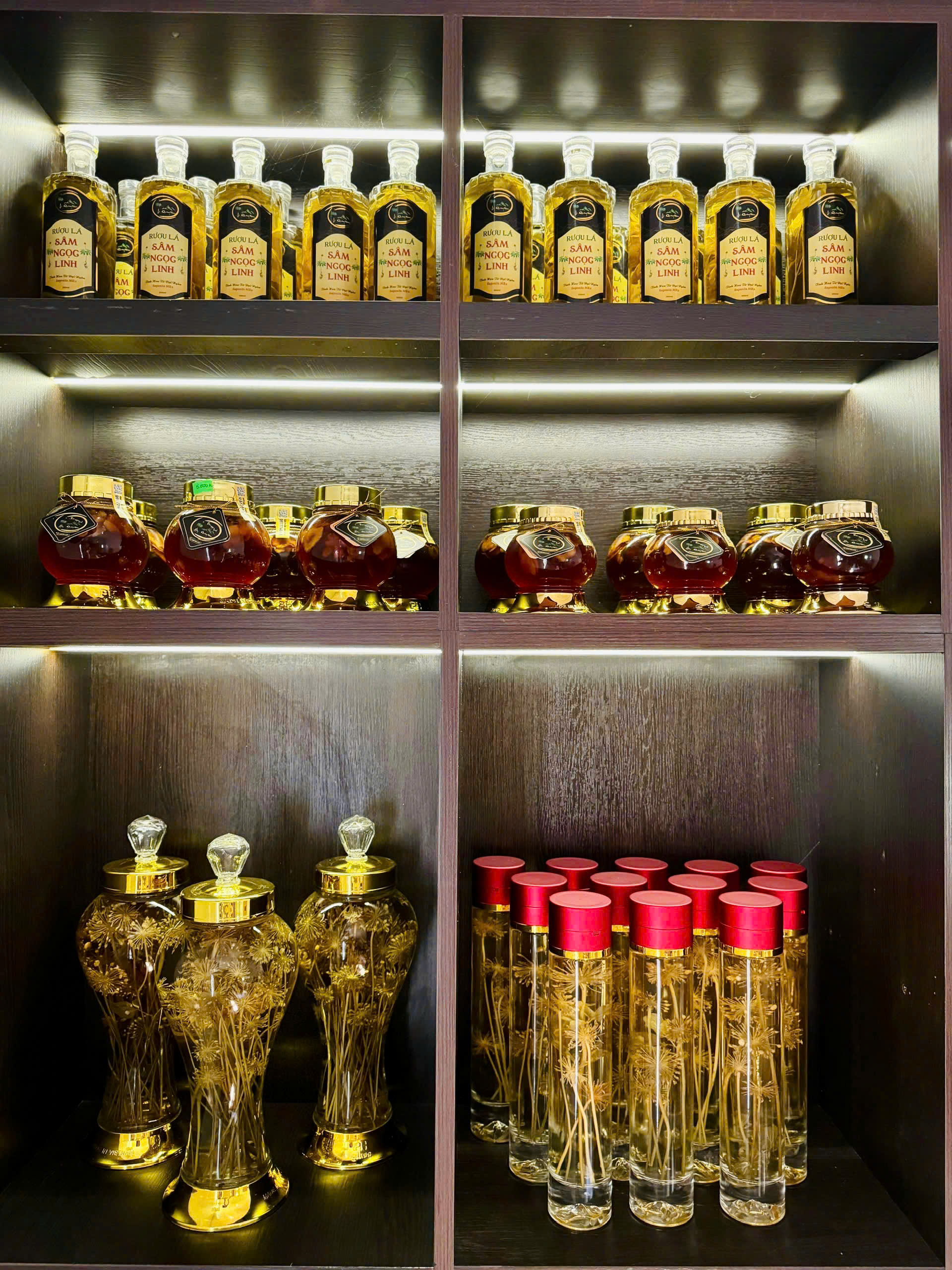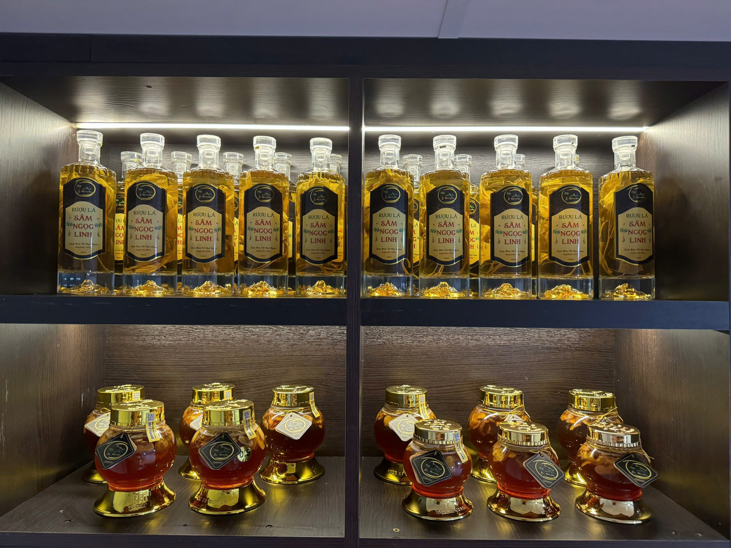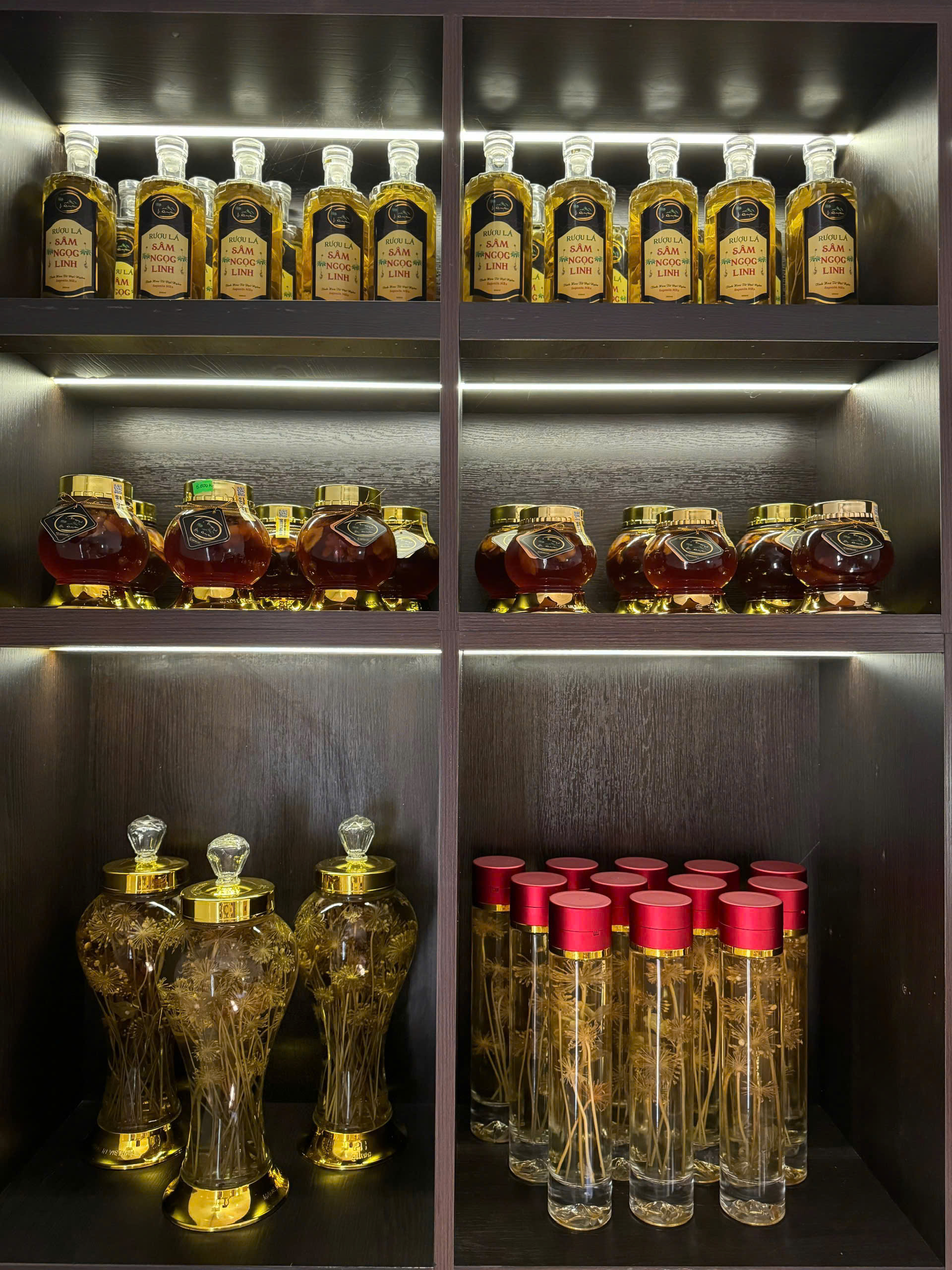 | Thành phần | Củ Sâm Ngọc Linh ngâm mật và lá Sâm Ngọc Linh ngâm rượu |